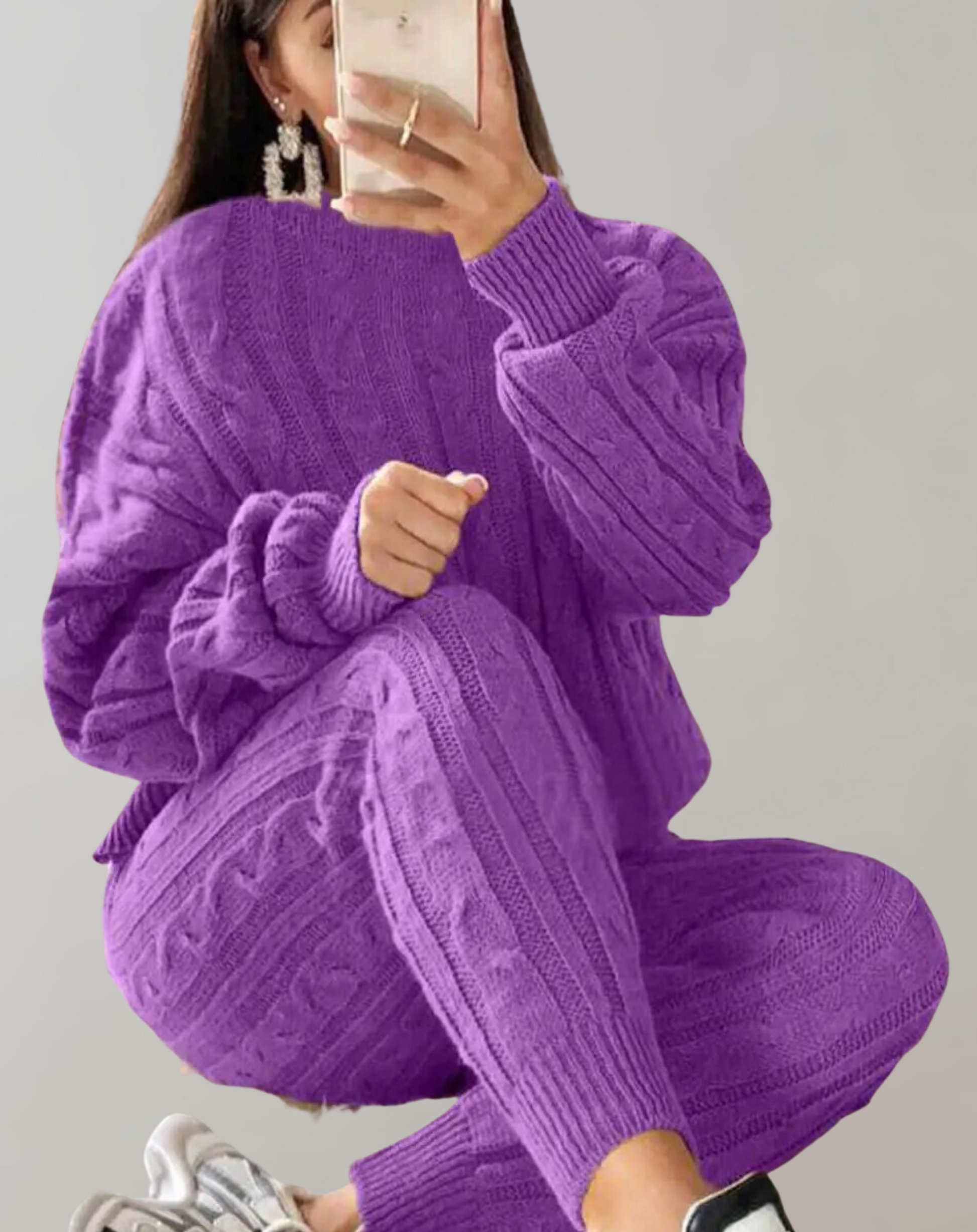 Experience the perfect blend of comfort and contemporary style with this exquisite knitted outfit. The long-sleeved sweater, featuring a unique shoulder knitting pattern, radiates warmth and sophistication, making it an essential addition to your cooler season wardrobe. Paired with stylish pants that boast a complementary knitting pattern at the waist, this outfit is designed to make you feel confident and fashionable, whether you're heading out for a casual brunch or a cozy night in.