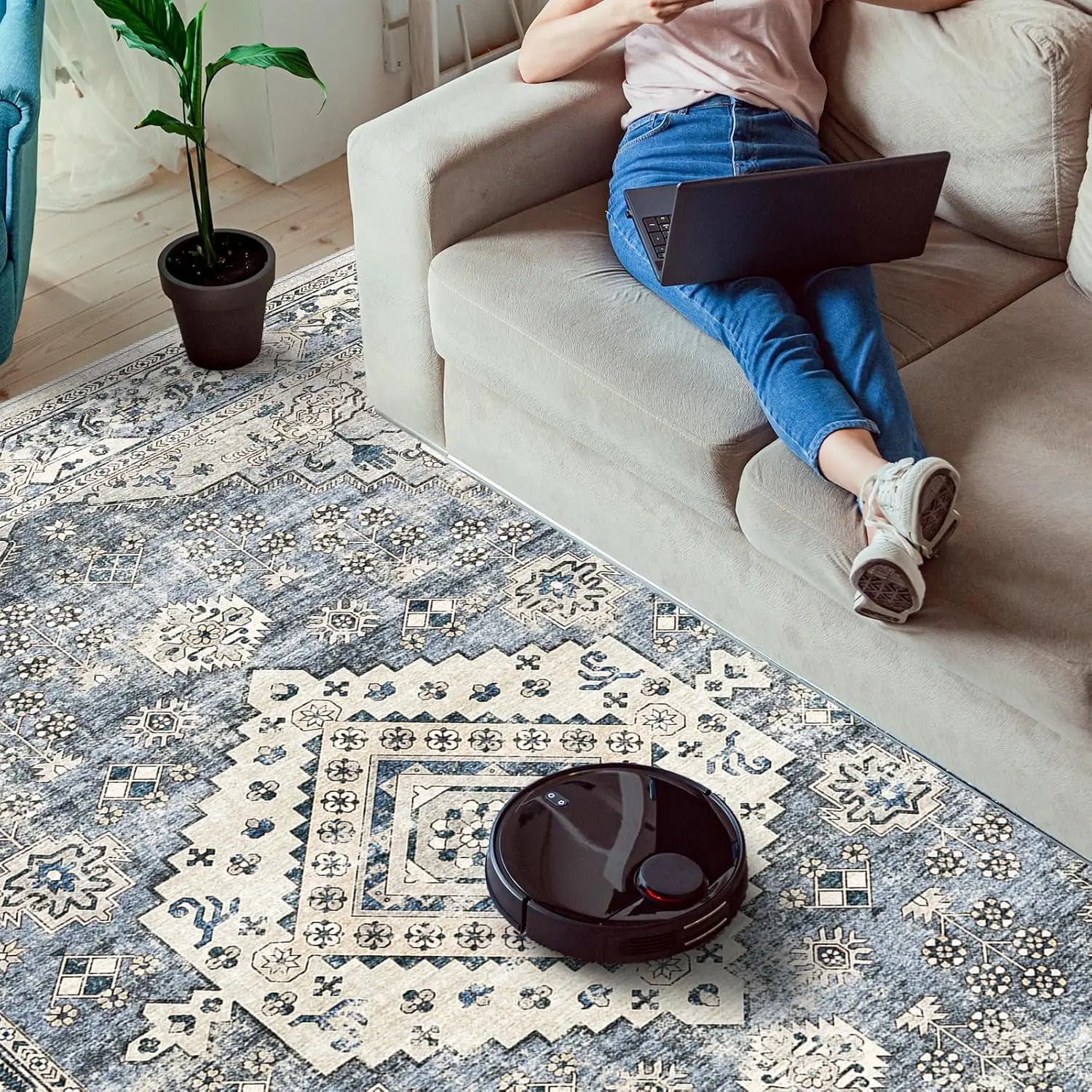Elevate your home with the timeless charm and practicality of this distressed boho rug.